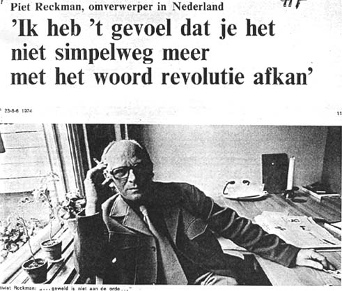 Een zeer betrokken dondersteen, die met een motie het tweede kabinet-Den Uyl zou hebben geblokkeerd. Maar hij was veel meer. Heel de wereld kon op hem rekenen.... (Anet Bleich in de Volkskrant, 19 juni 2007). Piet Reckman, ook wel de 'Lenin van Odijk', was een van de kleurrijkste persoonlijkheden uit de Nw-Dennendalgeschiedenis. Hij drukte daar zijn eigen onuitwisbare, felrode stempel op. Er was de Sneeuwbal 'de factor-Reckman', maar hij kwam er tot dusver op nieuw-dennendal.nl wat bekaaid vanaf, zeker in de inmemoriamrubriek. Vandaar nu een nieuwe poging Reckmans bijdrage recht te doen. Hierbij alvast een korte biografie en een overzicht van zijn publicaties. Er ontbreekt nog veel, zoals bijvoorbeeld de rol die hij speelde bij de Sociale Academie De Horst. Graag informatie en herinneringen over Reckman opsturen naar hansgrimm@chello.nl. Biografie Piet Reckman maakte in de jaren vijftig deel uit van de Pleingroep van pater-journalist Simon Jelsma, die de grondvesten voor de beweging legde met een redevoering op het Plein in Den Haag, op pinksterzaterdag 1954, over de problemen van de Derde Wereld. De groep wilde de bevolking bewust maken van het armoedevraagstuk en de mondiale ongelijkheid. Vanuit de Pleingroep ontstonden de actiegemeenschap Sjaloom in Odijk, de Novib, het XminY Solidariteitsfonds en de wereldwinkels. Reckman was altijd bezig met het ontwikkelen van zijn eigen acties. Zo kwam hij in 1968 met het "Witte Huis aan Huis plan", een campagne waarbij vrijwilligers langs de deuren gingen om briefkaarten af te geven die konden worden gestuurd naar een Amerikaanse burger. Bedoeling was kritiek uit te oefenen op het Amerikaanse beleid in Vietnam en zo mogelijk de beëindiging van de Vietnamoorlog te bespoedigen. In januari 1974 werd Reckman bestuurslid van eerst de werkgroep-Dennendalbestuur en later Nieuw-Dennendal. Hij speelde tot aan de ontruiming van paviljoen Lorentz in juli dat jaar in de media en de politiek een belangrijke rol, zowel achter de schermen als voor de microfoon. In 1977 haalde hij de voorpagina's door tijdens de kabinetsformatie op een cruciale zitting van de Partijraad van de PvdA een kritische motie in te dienen, waarin hij stelde dat de PvdA niet als 'puinruimer van rechts' mocht fungeren. De motie werd met 53 tegen 35 stemmen aangenomen. Daarmee was overigens niet het doek over de formatie gevallen. De PvdA-tweedekamerfractie legde zich in meerderheid niet bij de uitspraak neer en er werd tot een buitengewoon partijcongres besloten, dat moest beslissen over het meningsverschil tussen Kamerfractie en Partijraad. Na mislukte onderhandelingen met het CDA gaf formateur Den Uyl nog vóór het congres zijn formatie-opdracht terug en maakte zo de weg vrij voor een kabinet Van Agt-Wiegel. (Anet Bleich in 'Joop Den Uyl 1919-1987: dromer en doordouwer' - blz 388.) Begin jaren negentig richtte Reckman de Mondiaal Sociale Beweging op, een stichting die derdewereldprojecten subsidieerde. In zijn latere loopbaan maakte Reckman nog een opmerkelijke switch. Hij ging de politie trainen. Zelf zag hij geen conflict met zijn eerdere optreden: het politiewerk paste naadloos in het buurt- en opbouwwerk waarbij altijd zijn prioriteit had gelegen. Maar buitenstaanders trokken de wenkbrauwen op. Tussendoor zat Reckman begin jaren zeventig in het Chili Komitee. Op zijn begrafenis, in 2007, bracht een groep Chilenen met gebalde vuist een eerbetoon aan 'Comrade' Reckman. | |